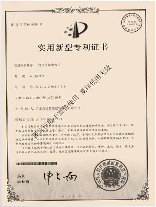 機房防塵窗戶證書